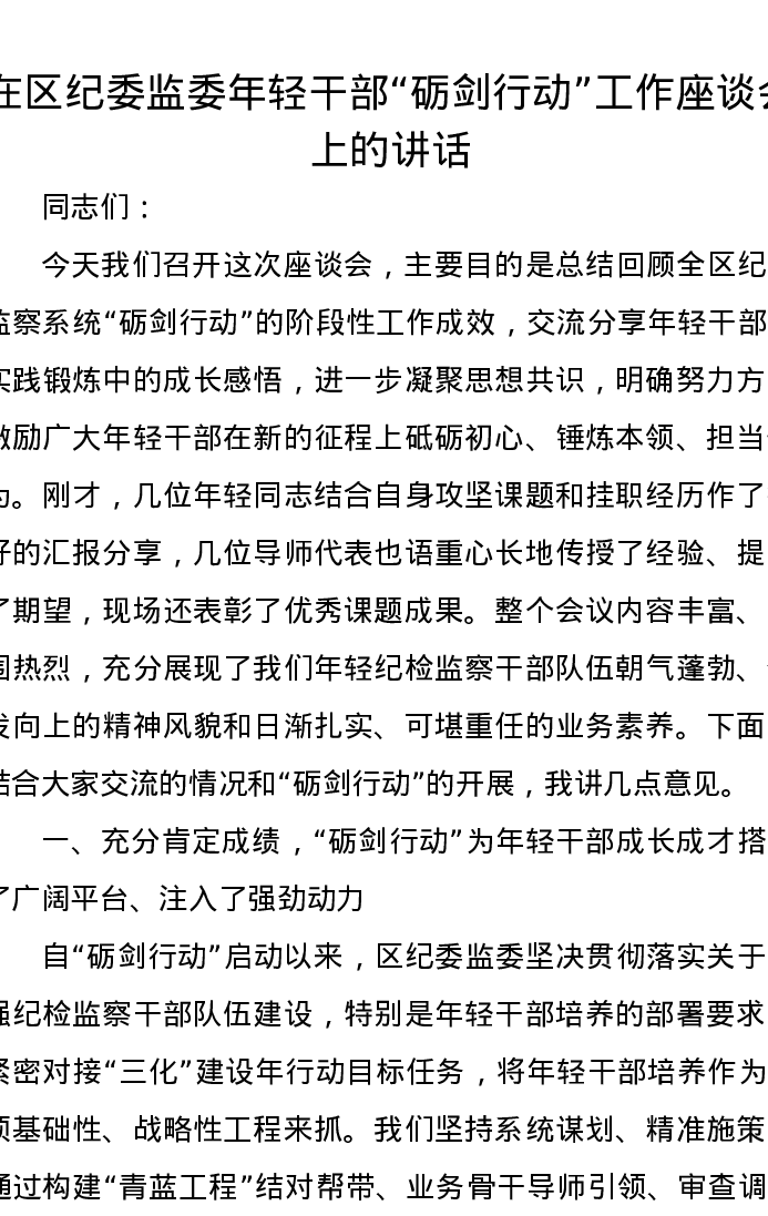 在区纪委监委年轻干部砺剑行动工作座谈会上的讲话