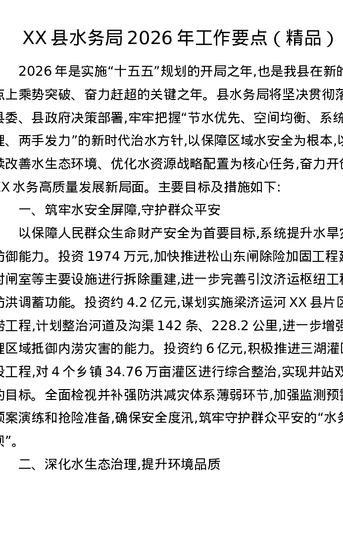 XX县水务局2026年工作要点