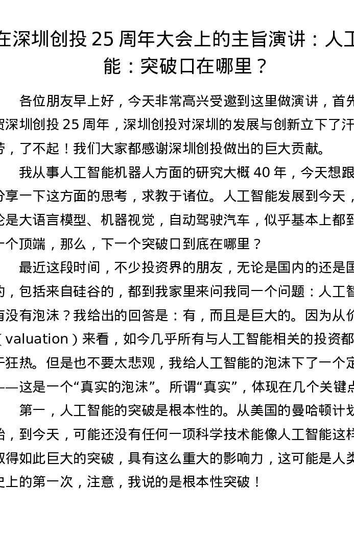 在深圳创投25周年大会上的主旨演讲:人工智能:突破口在哪里?