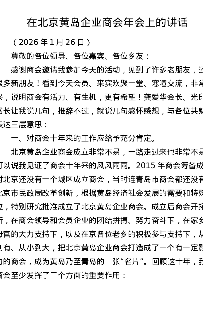 在北京黄岛企业商会年会上的讲话