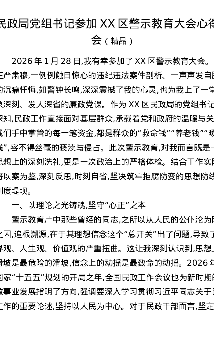 民政局党组书记参加XX区警示教育大会心得体会
