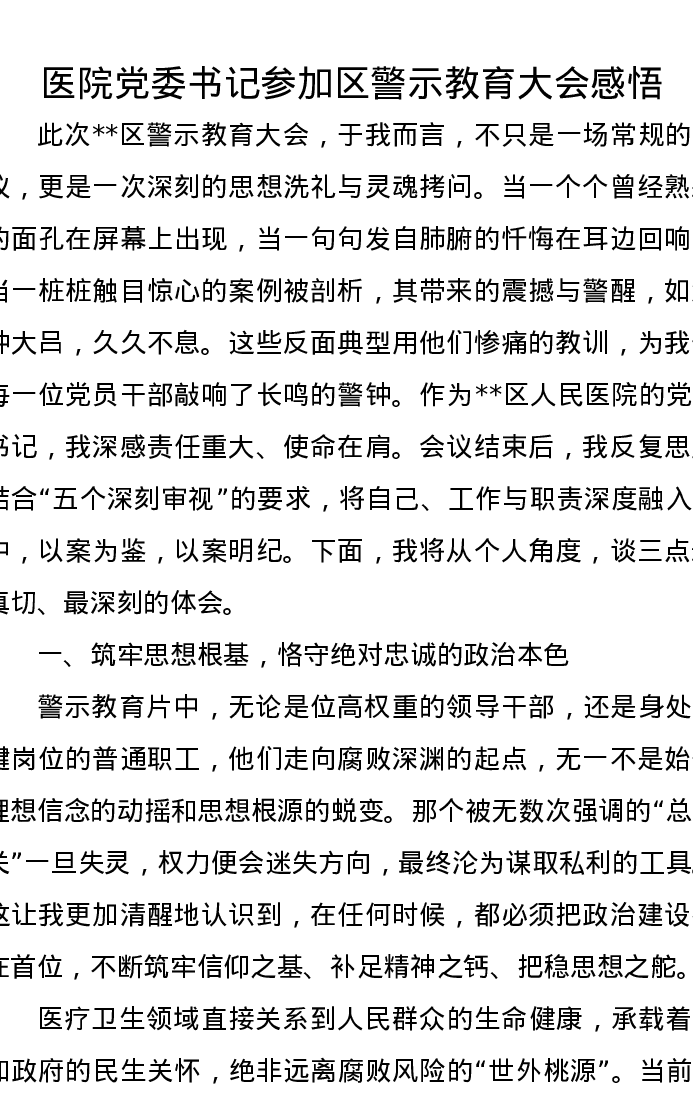 医院党委书记参加区警示教育大会感悟