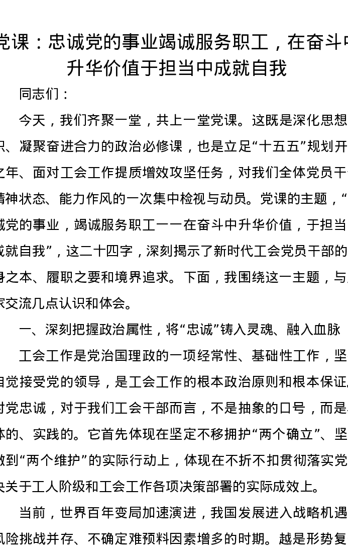 党课:忠诚党的事业竭诚服务职工,在奋斗中升华价值于担当中成就自我