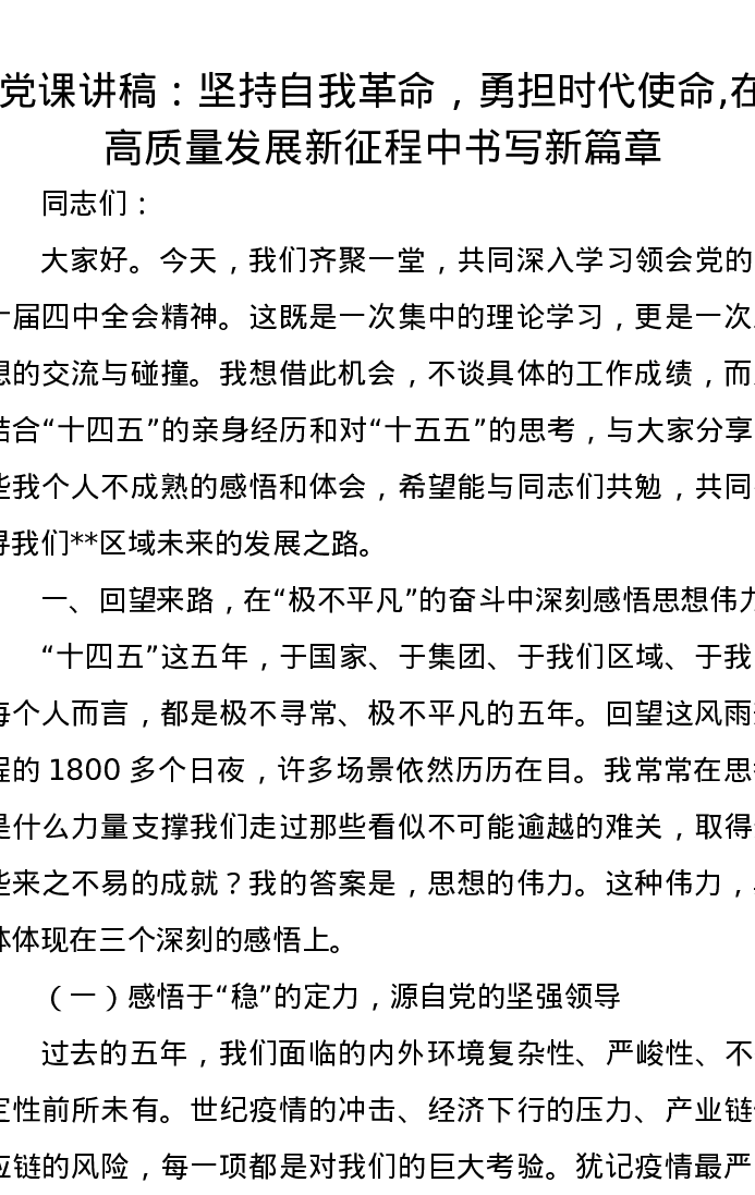 党课讲稿:坚持自我革命,勇担时代使命,在高质量发展新征程中书写新篇章