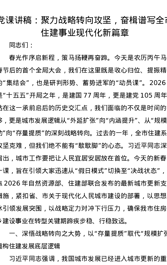 党课讲稿:聚力战略转向攻坚,奋楫谱写全市住建事业现代化新篇章