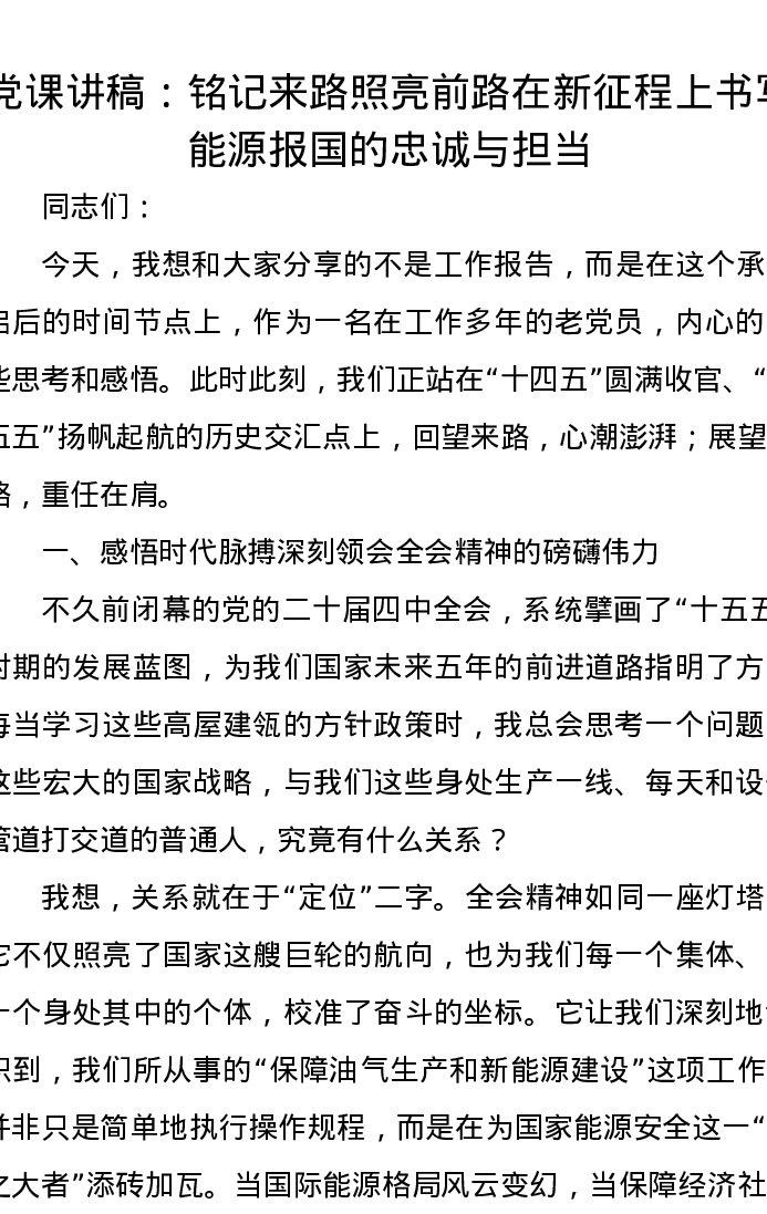 党课讲稿:铭记来路照亮前路 在新征程上书写能源报国的忠诚与担当