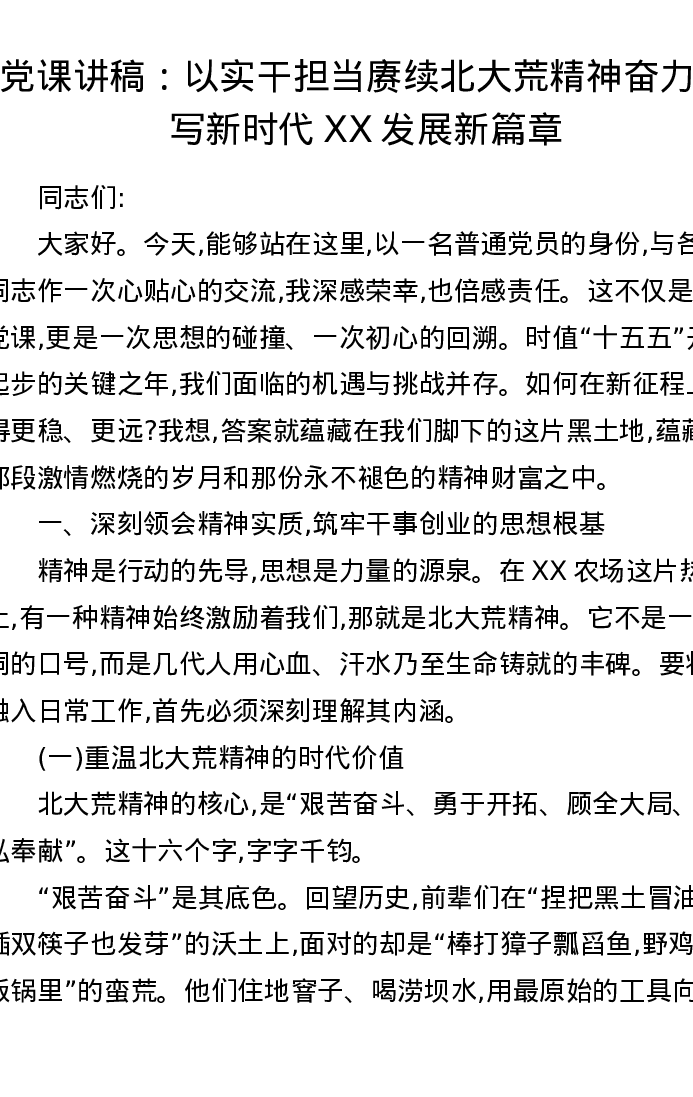 党课讲稿:以实干担当赓续北大荒精神 奋力书写新时代XX发展新篇章