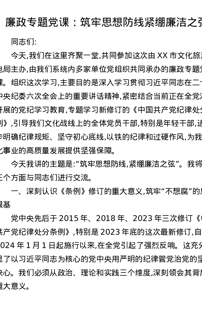 廉政专题党课:筑牢思想防线 紧绷廉洁之弦