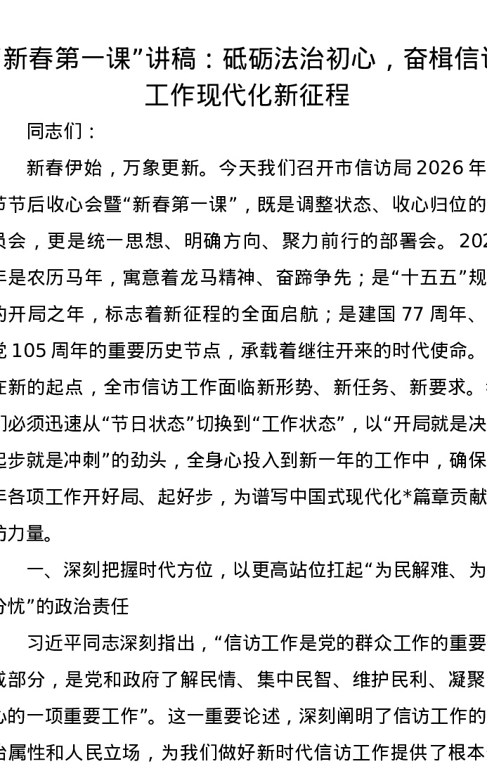 新春第一课讲稿:砥砺法治初心,奋楫信访工作现代化新征程
