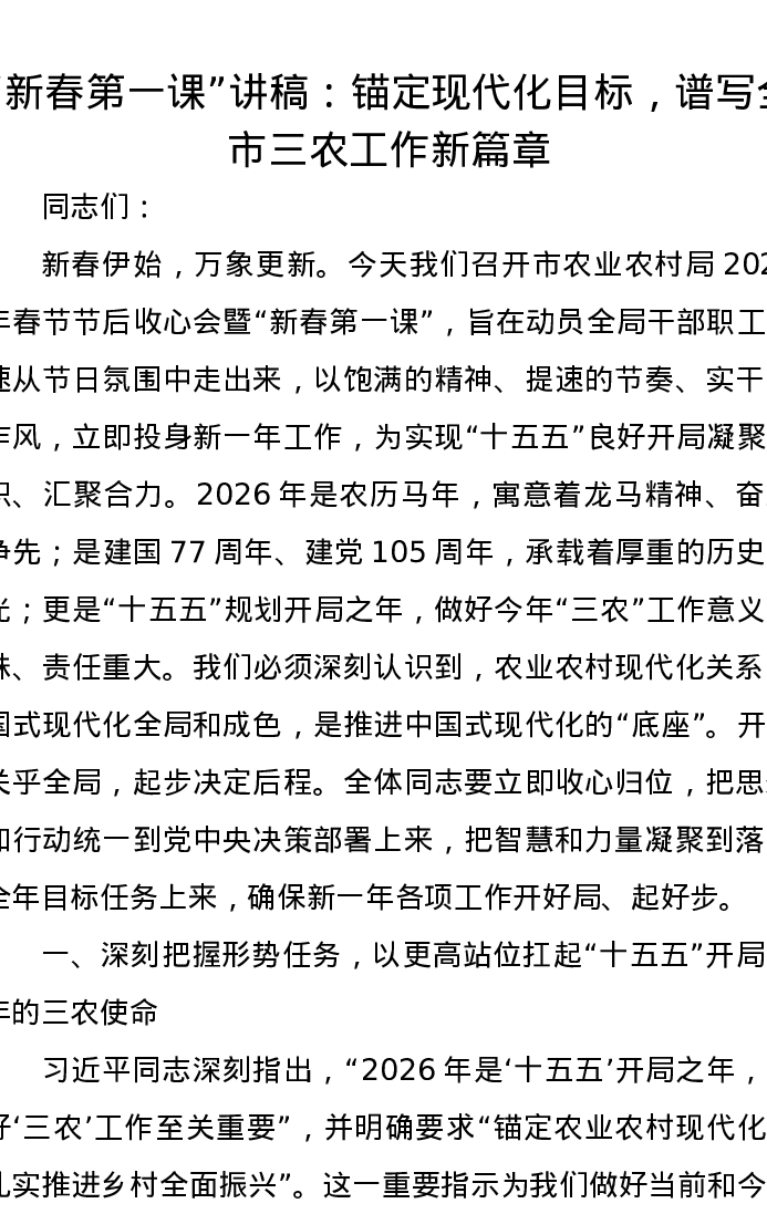 新春第一课讲稿:锚定现代化目标,谱写全市三农工作新篇章