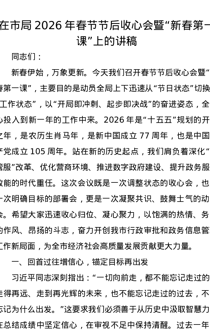 在市局2026年春节节后收心会暨新春第一课上的讲稿
