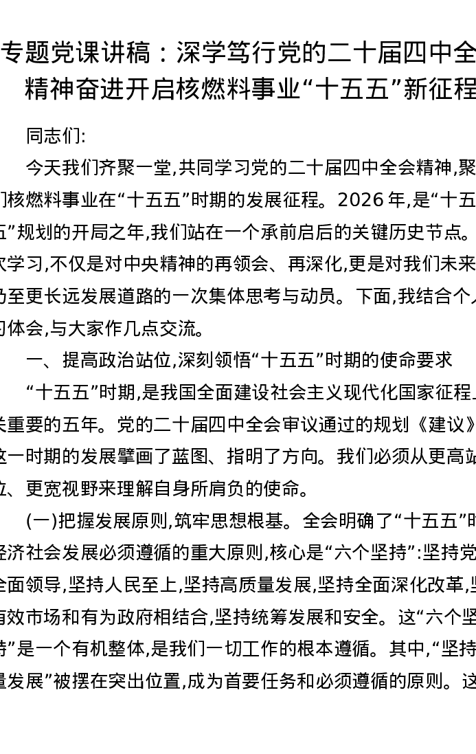 专题党课讲稿:深学笃行党的二十届四中全会精神 奋进开启核燃料事业十五五新征程