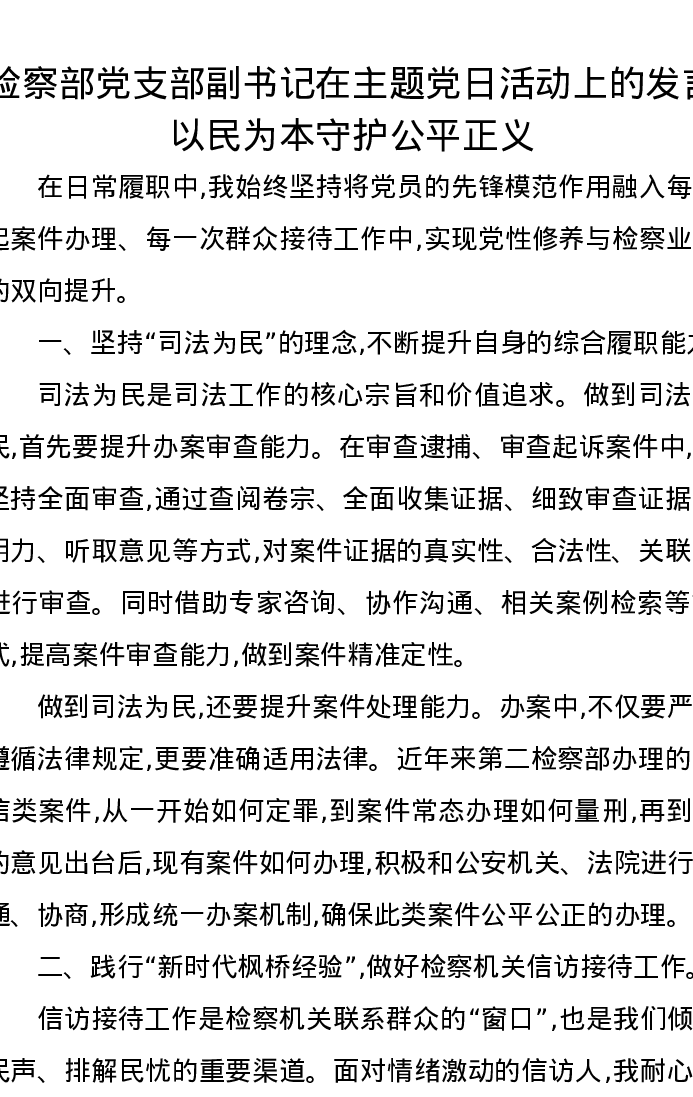检察部党支部副书记在主题党日活动上的发言以民为本守护公平正义