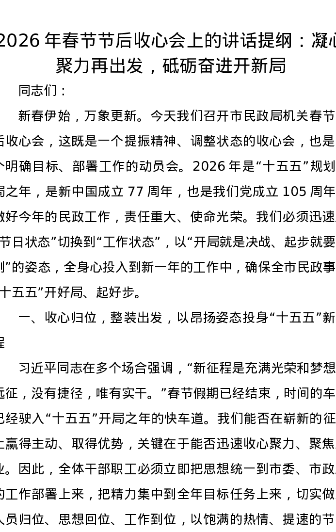 2026年春节节后收心会上的讲话提纲:凝心聚力再出发,砥砺奋进开新局