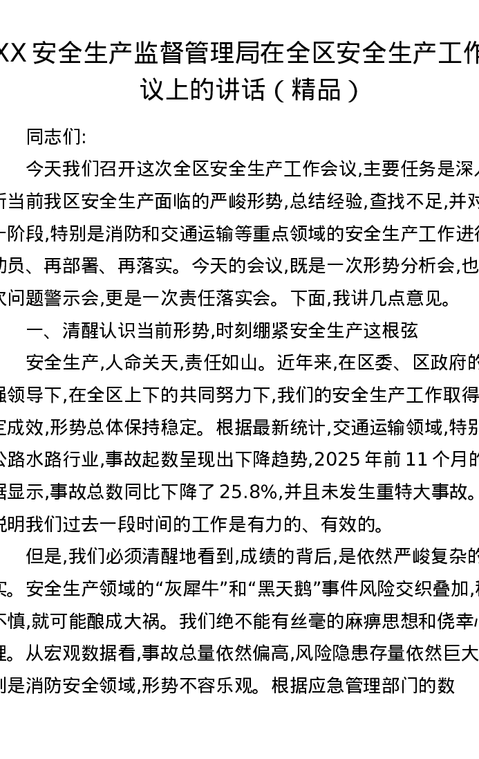 XX安全生产监督管理局在全区安全生产工作会议上的讲话