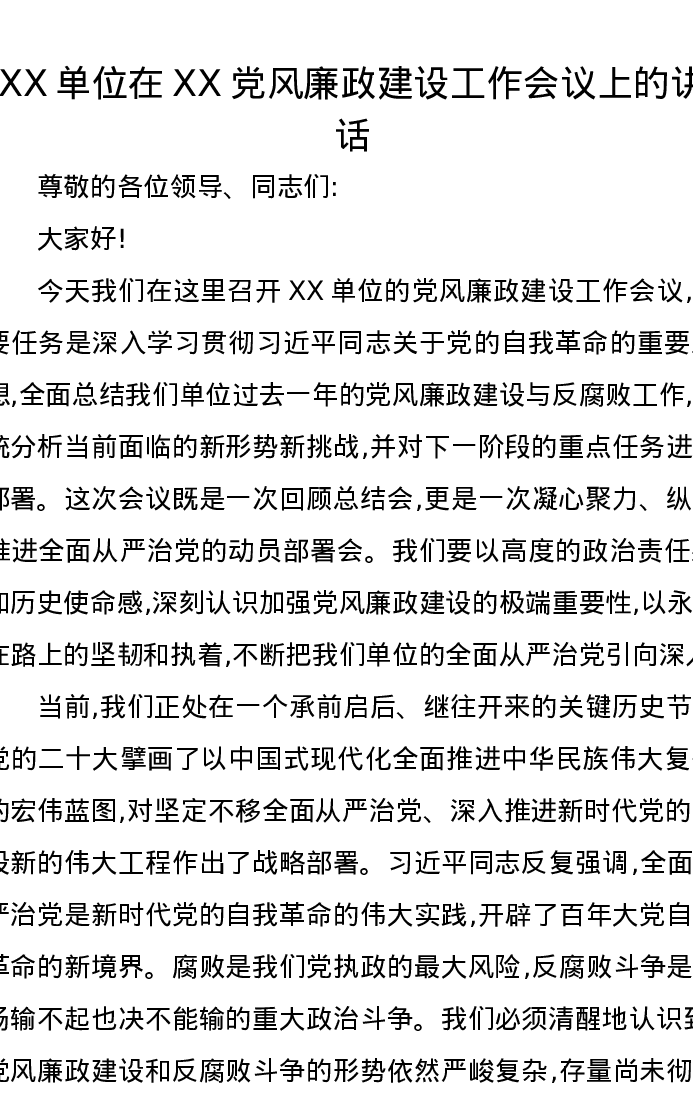 XX单位在XX党风廉政建设工作会议上的讲话