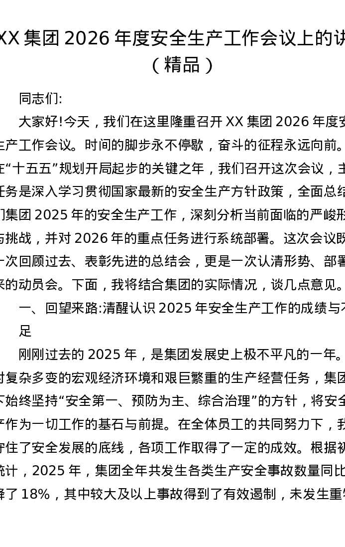 XX集团2026年度安全生产工作会议上的讲话