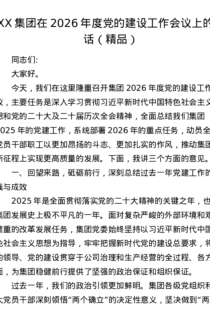 XX集团在2026年度党的建设工作会议上的讲话