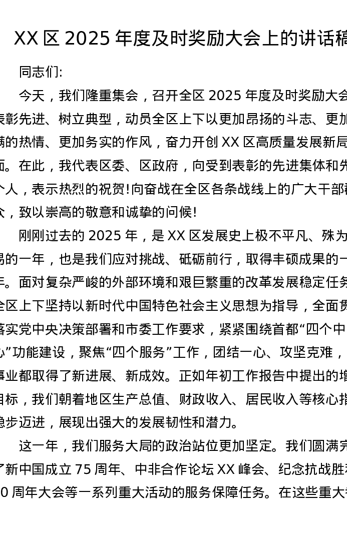 XX区2025年度及时奖励大会上的讲话稿