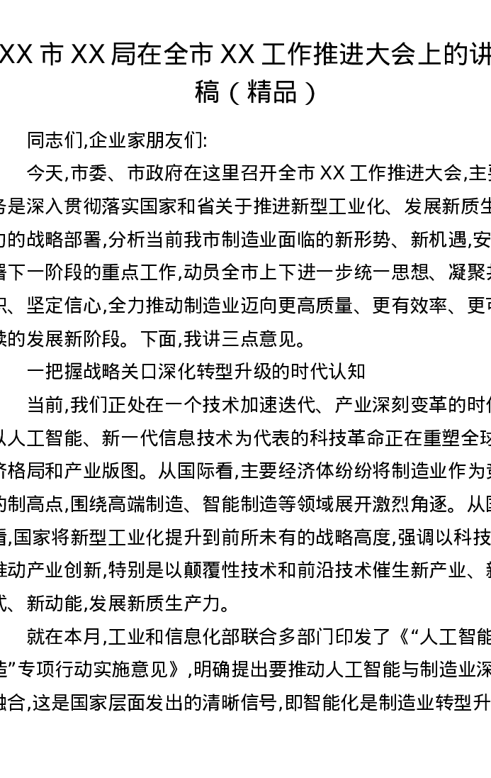 XX市XX局在全市XX工作推进大会上的讲话稿