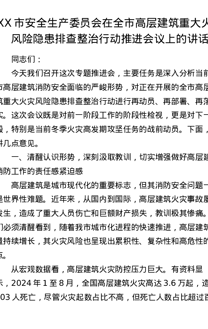 XX市安全生产委员会在全市高层建筑重大火灾风险隐患排查整治行动推进会议上的讲话