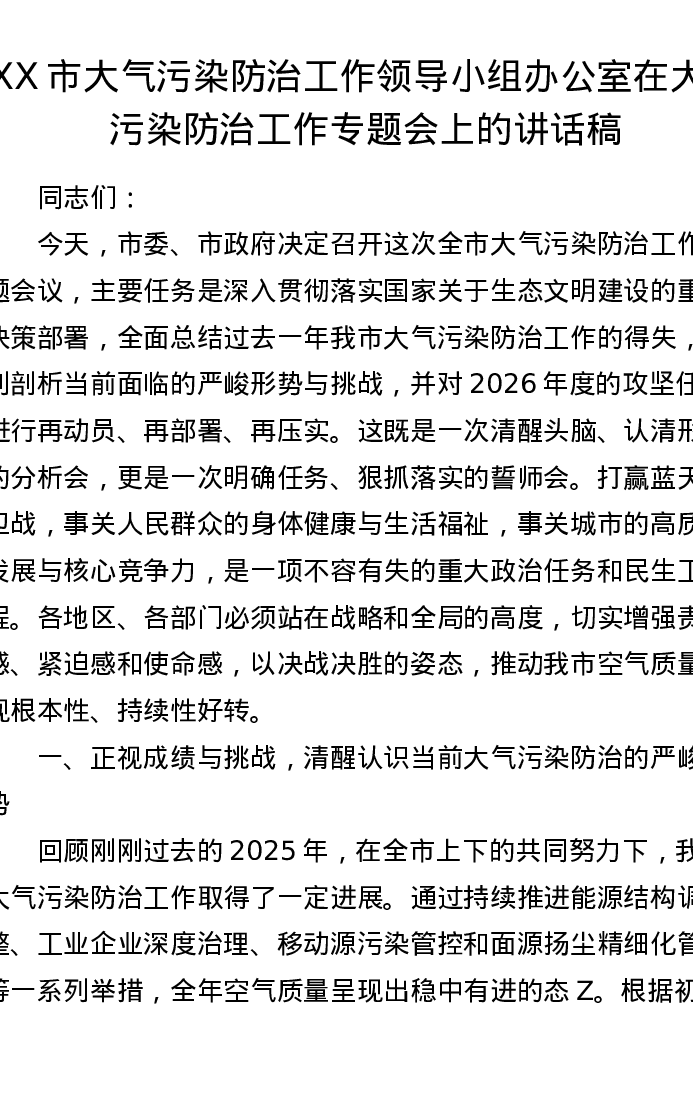 XX市大气污染防治工作领导小组办公室在大气污染防治工作专题会上的讲话稿