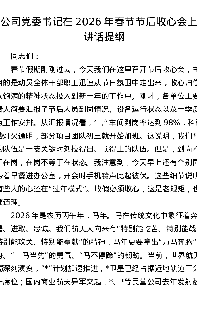 公司党委书记在2026年春节节后收心会上的讲话提纲