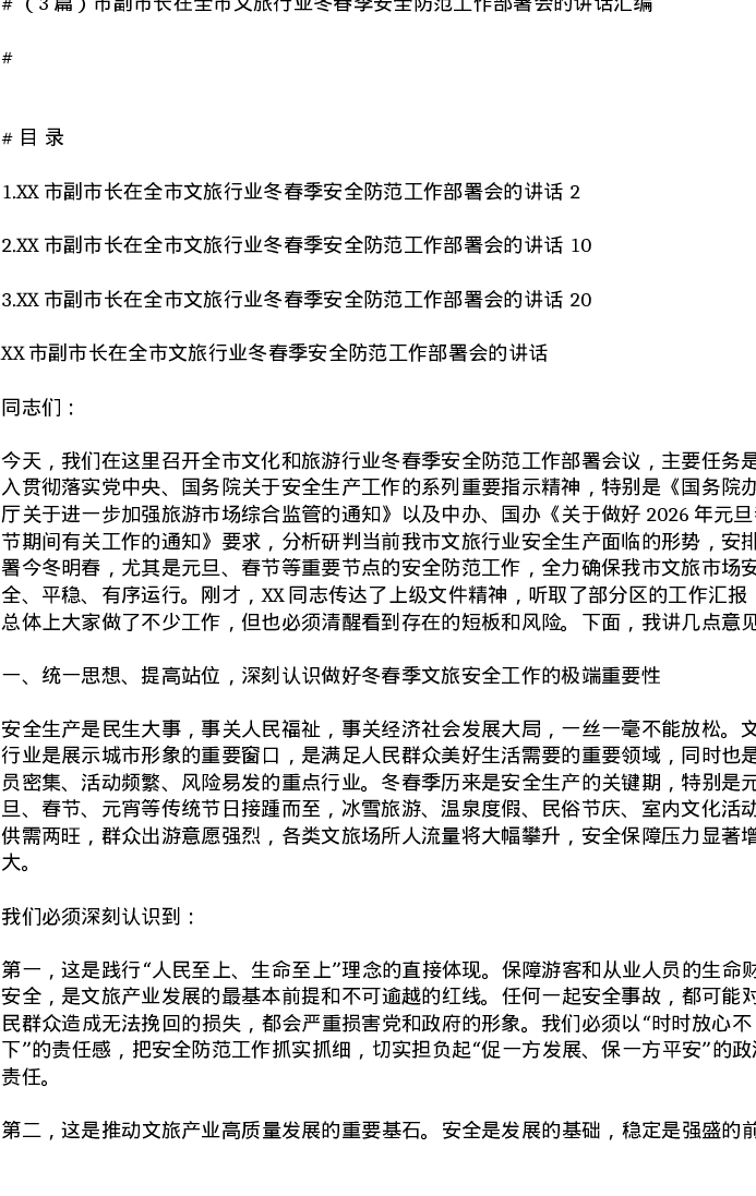 汇编:市副市长在全市文旅行业冬春季安全防范工作部署会的讲话3篇