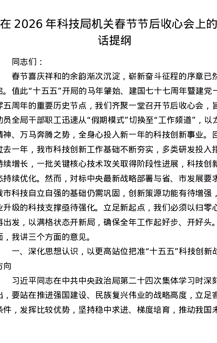 在2026年科技局机关春节节后收心会上的讲话提纲