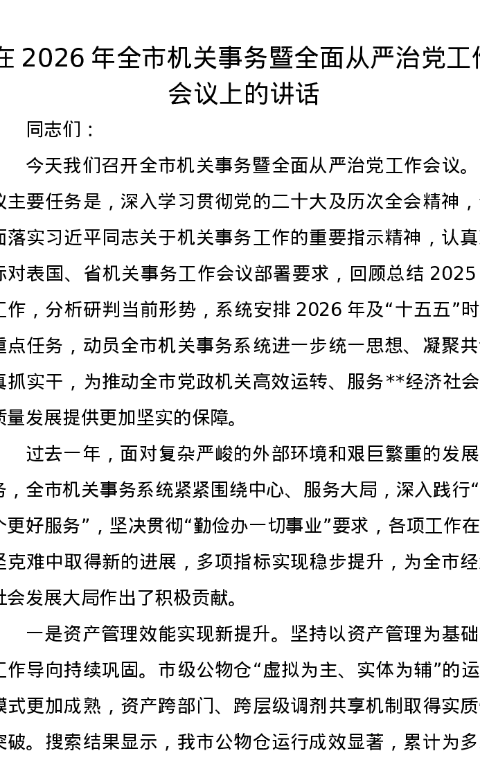在2026年全市机关事务暨全面从严治党工作会议上的讲话