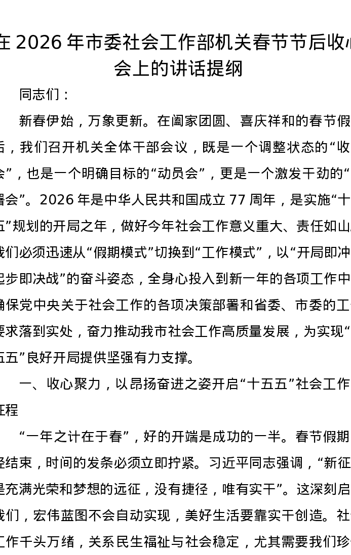 在2026年市委社会工作部机关春节节后收心会上的讲话提纲