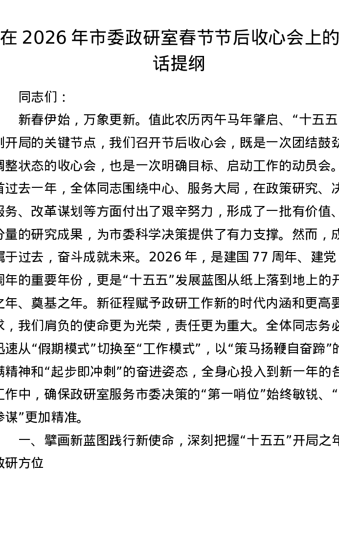 在2026年市委政研室春节节后收心会上的讲话提纲