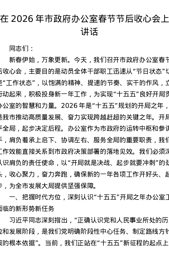 在2026年市政府办公室春节节后收心会上的讲话
