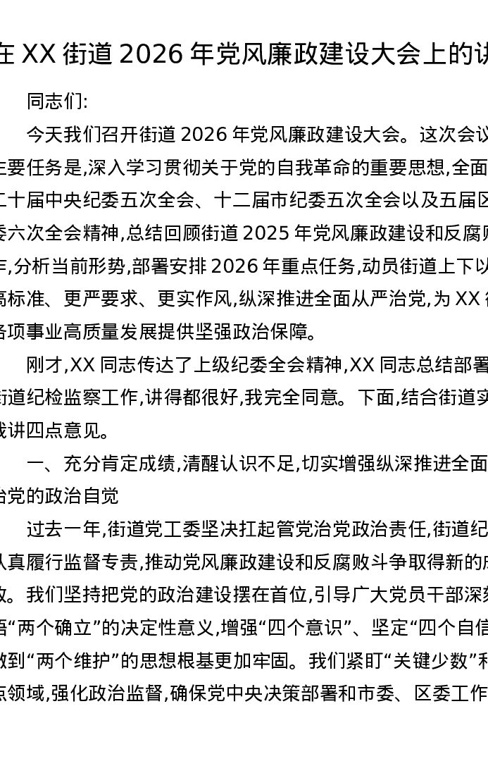 在XX街道2026年党风廉政建设大会上的讲话