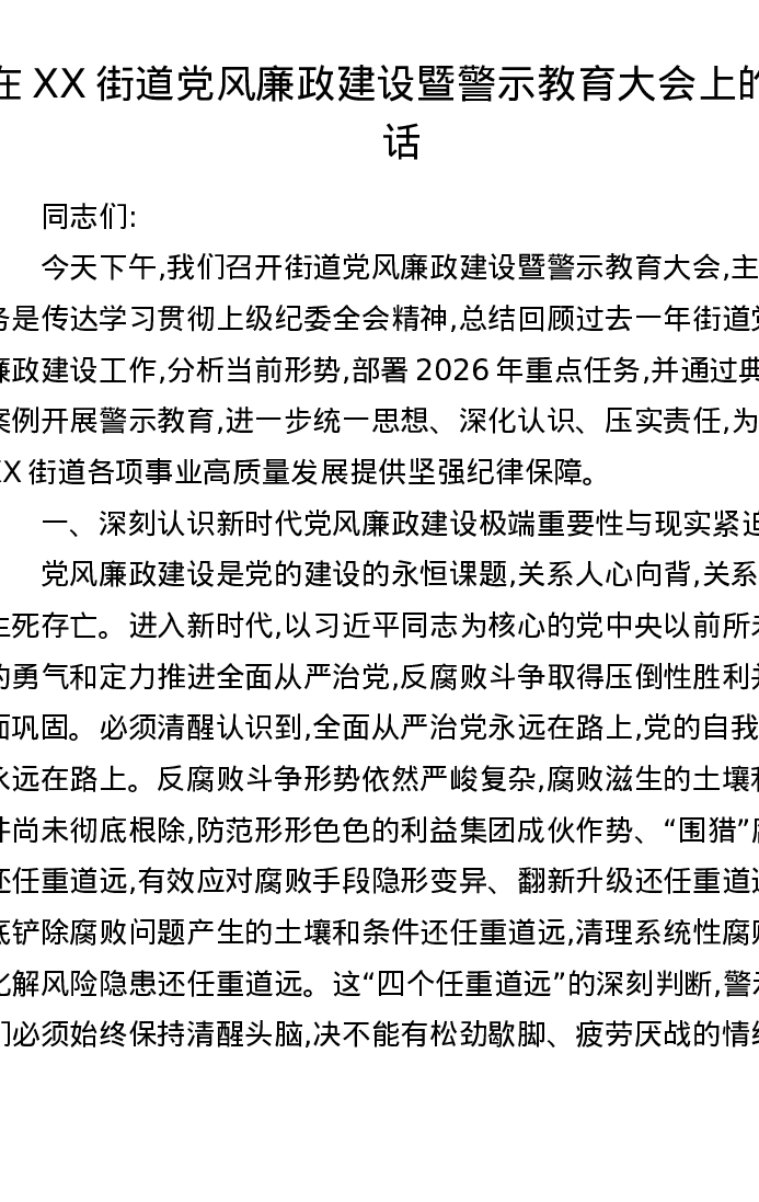 在XX街道党风廉政建设暨警示教育大会上的讲话