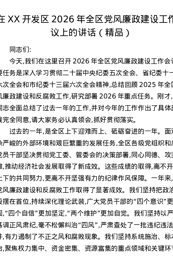 在XX开发区2026年全区党风廉政建设工作会议上的讲话