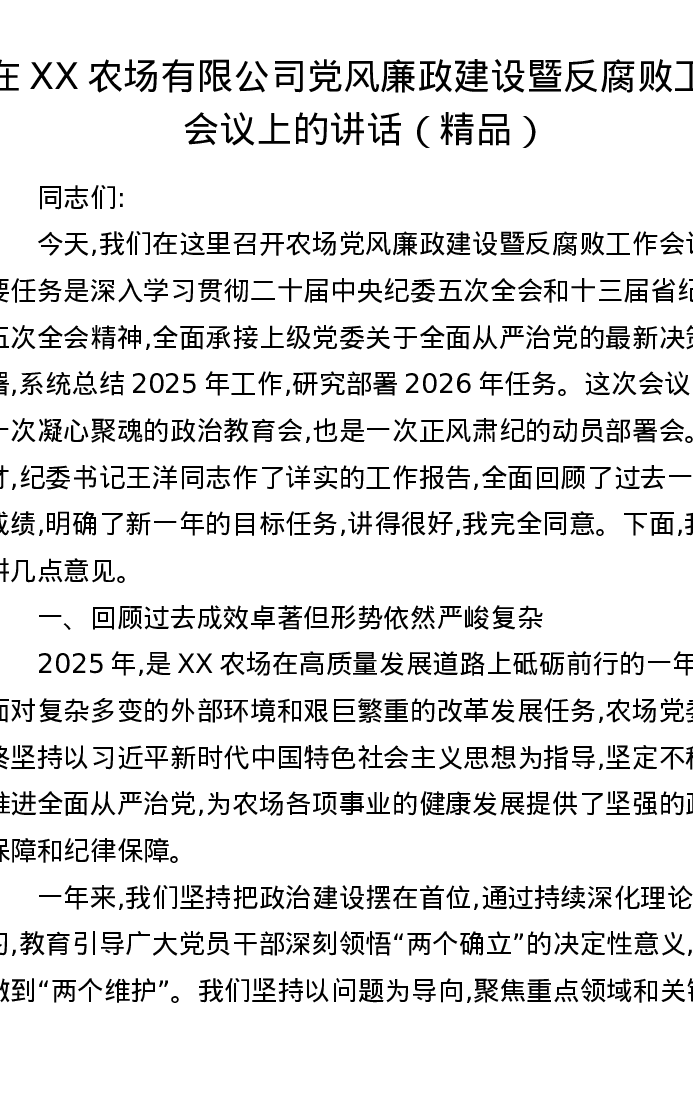 在XX农场有限公司党风廉政建设暨反腐败工作会议上的讲话