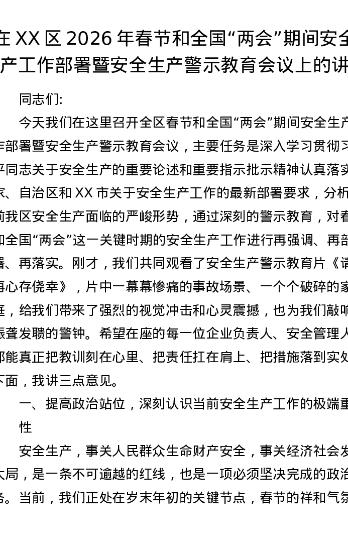 在XX区2026年春节和全国两会期间安全生产工作部署暨安全生产警示教育会议上的讲话