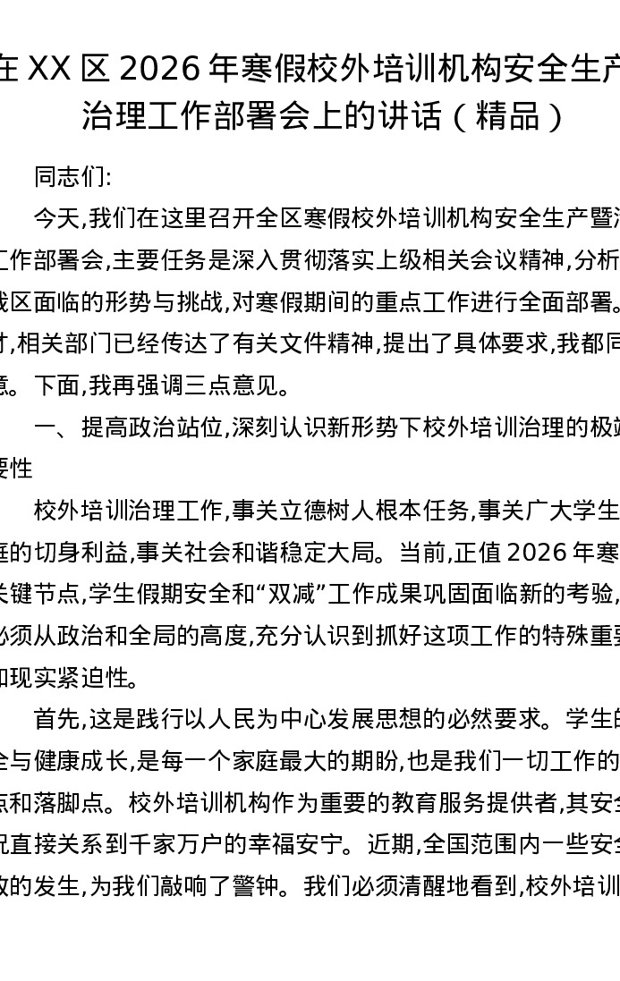 在XX区2026年寒假校外培训机构安全生产暨治理工作部署会上的讲话