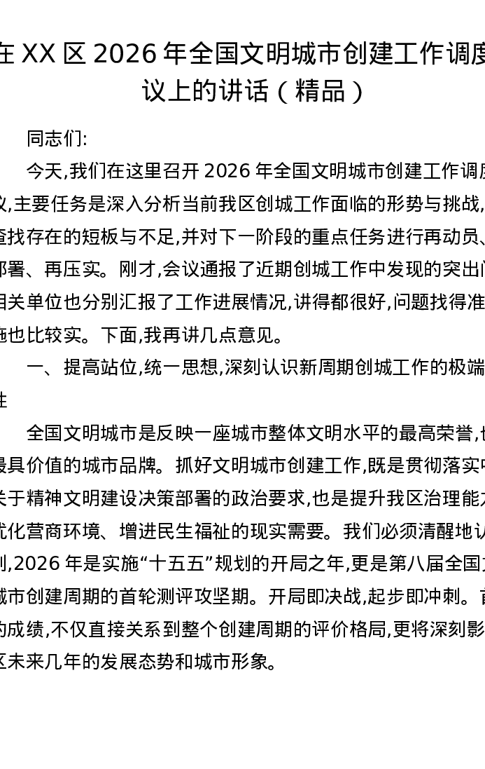 在XX区2026年全国文明城市创建工作调度会议上的讲话