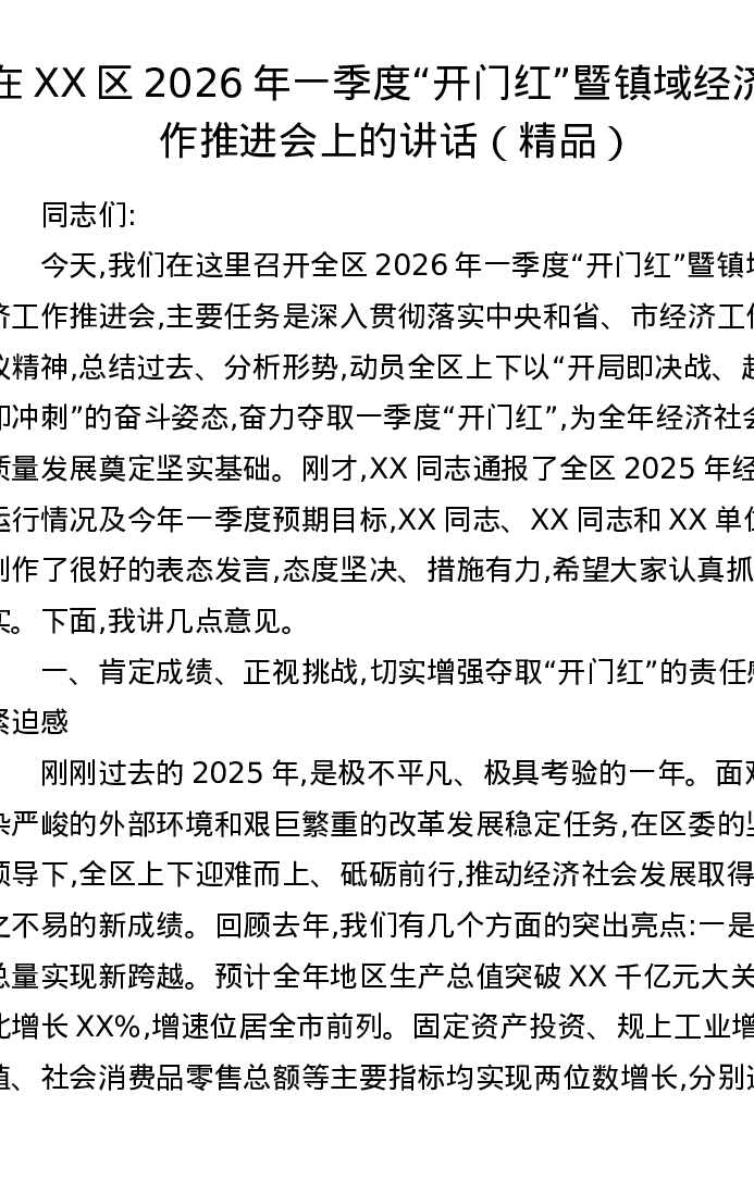 在XX区2026年一季度开门红暨镇域经济工作推进会上的讲话