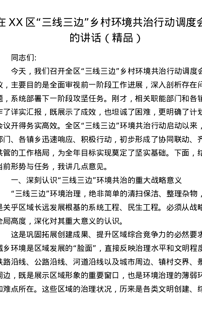 在XX区三线三边乡村环境共治行动调度会上的讲话