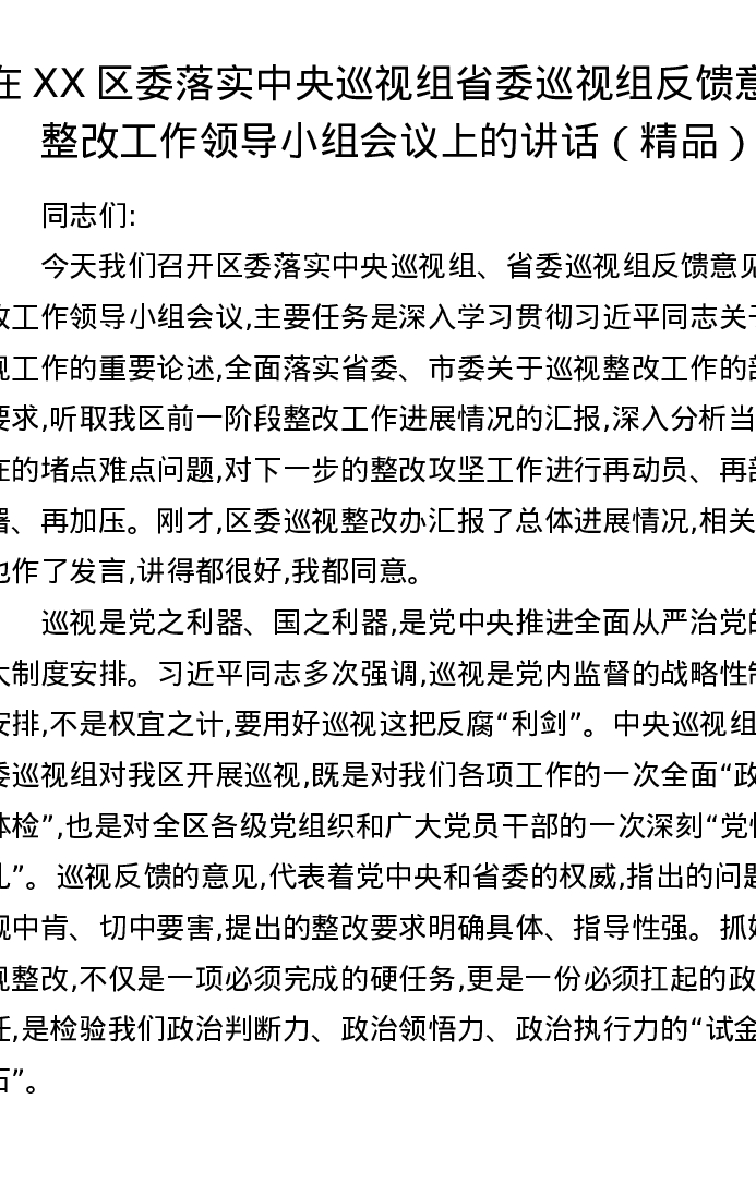 在XX区委落实中央巡视组省委巡视组反馈意见整改工作领导小组会议上的讲话