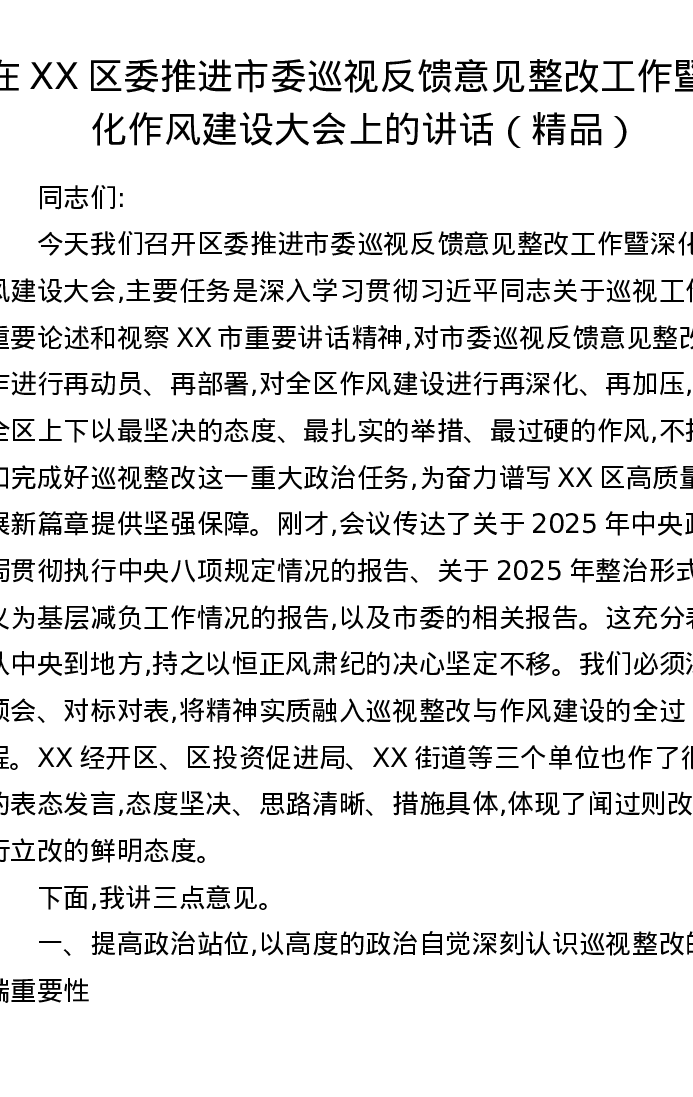 在XX区委推进市委巡视反馈意见整改工作暨深化作风建设大会上的讲话