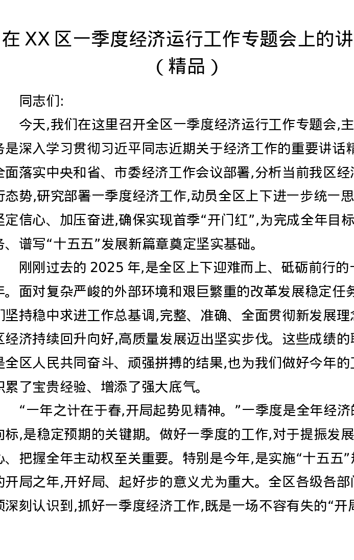 在XX区一季度经济运行工作专题会上的讲话