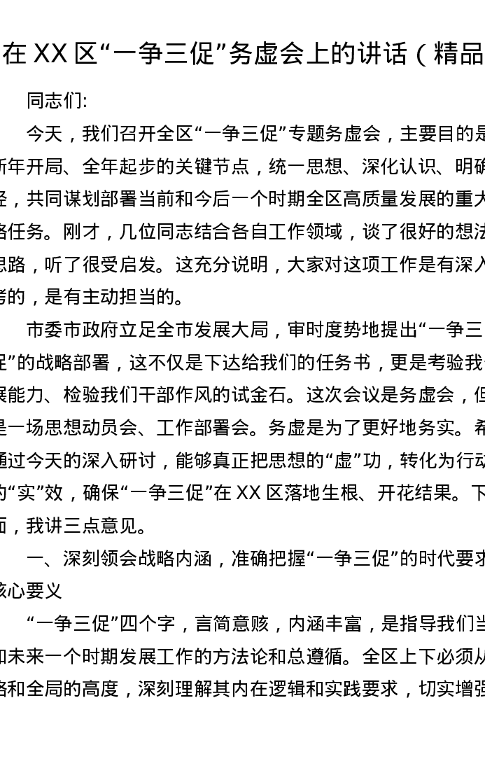 在XX区一争三促务虚会上的讲话