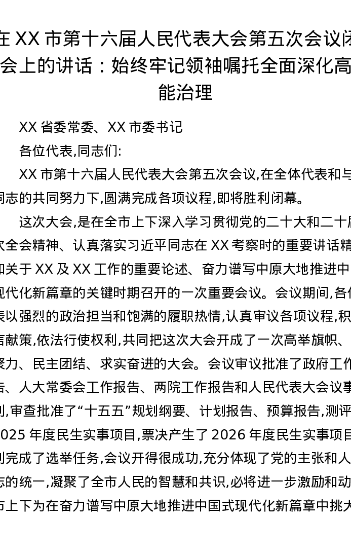 在XX市第十六届人民代表大会第五次会议闭幕会上的讲话:始终牢记领袖嘱托 全面深化高效能治理
