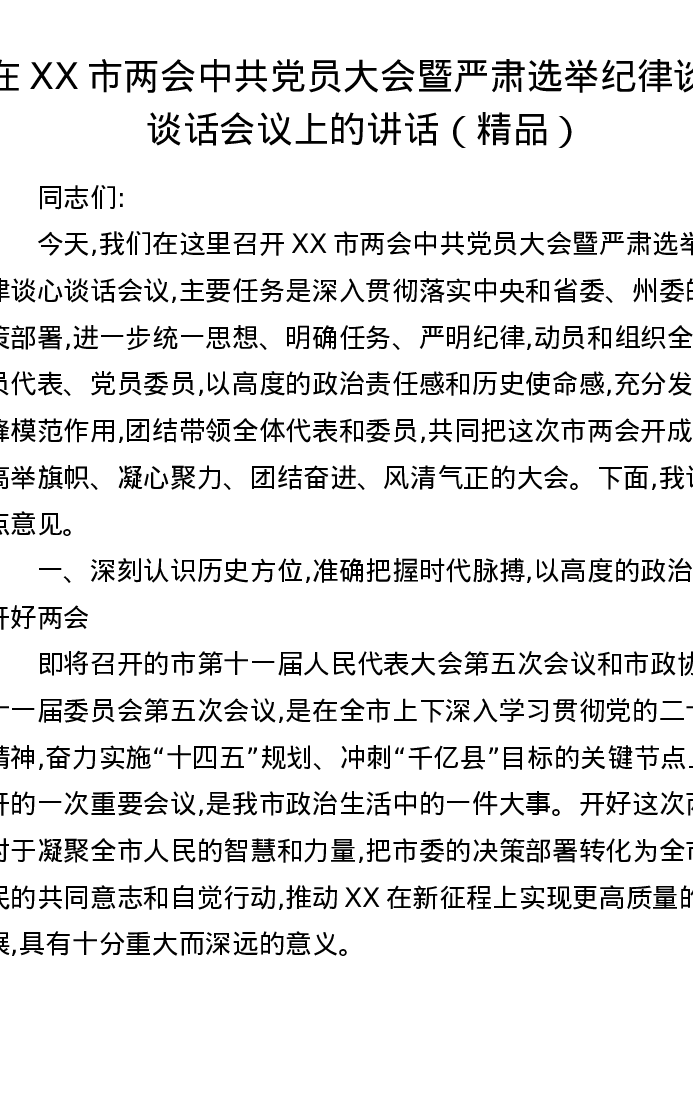 在XX市两会中共党员大会暨严肃选举纪律谈心谈话会议上的讲话