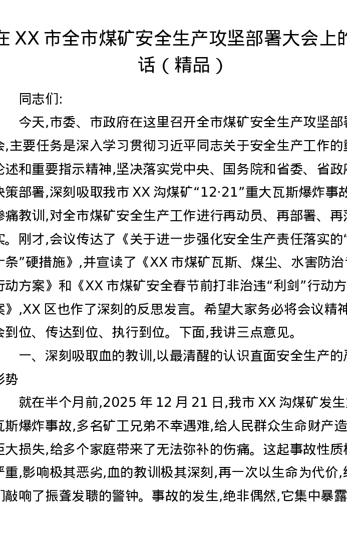 在XX市全市煤矿安全生产攻坚部署大会上的讲话
