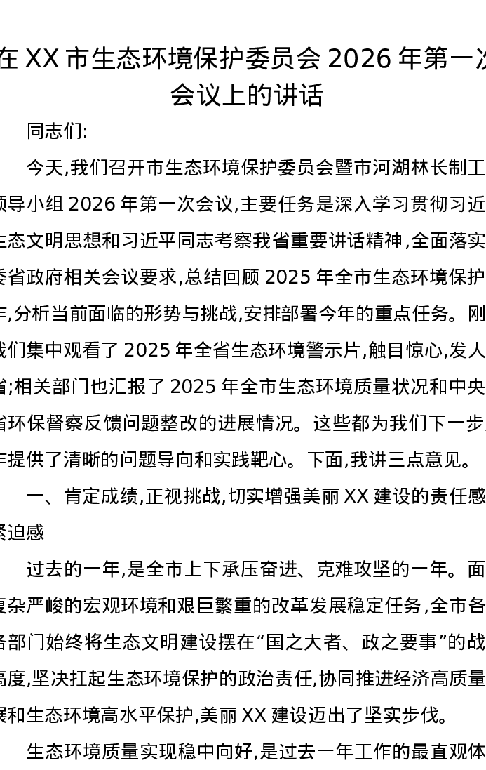在XX市生态环境保护委员会2026年第一次会议上的讲话